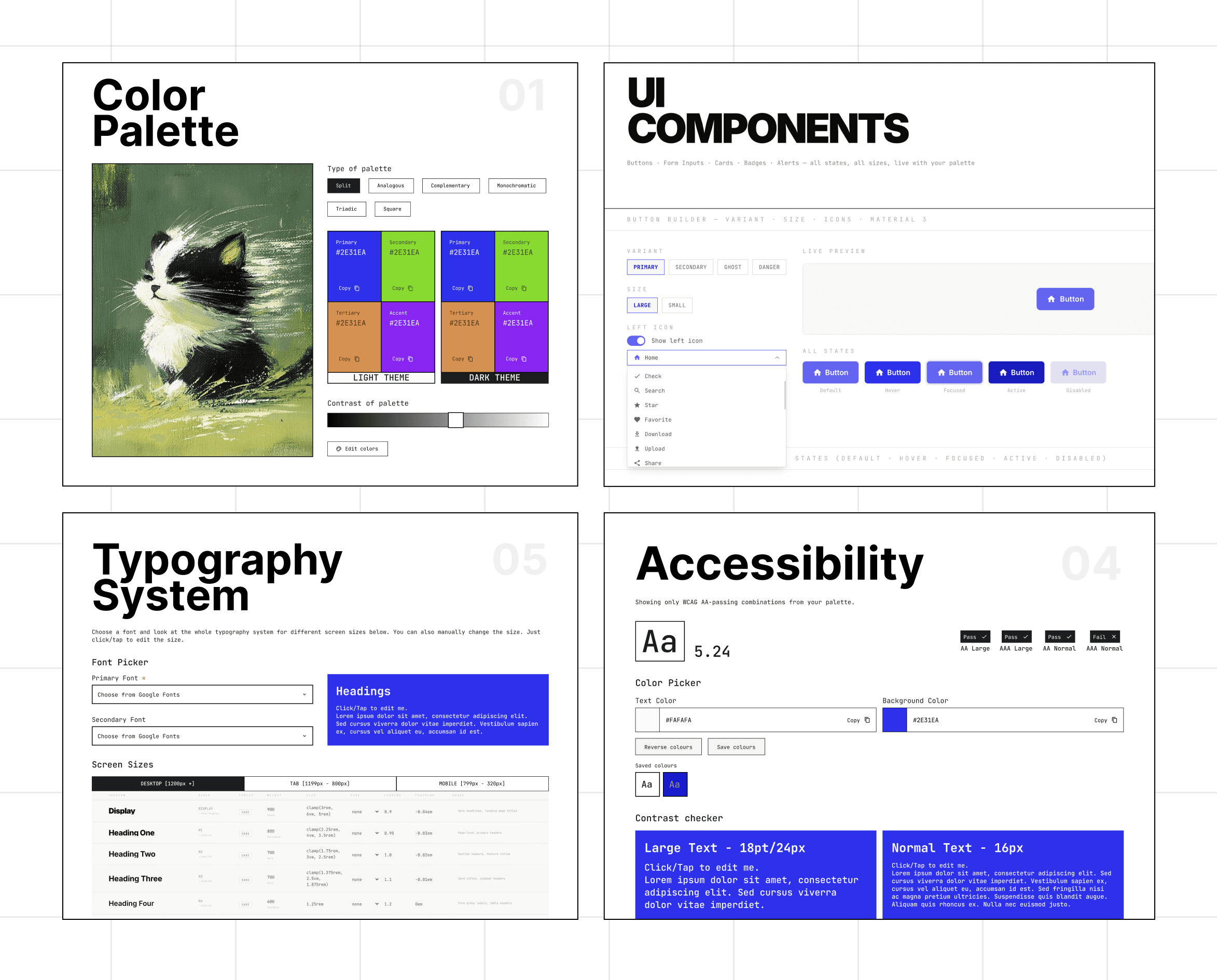 Create palette from image or a primary color, change fonts, check accessibility and preview button component before exporting.