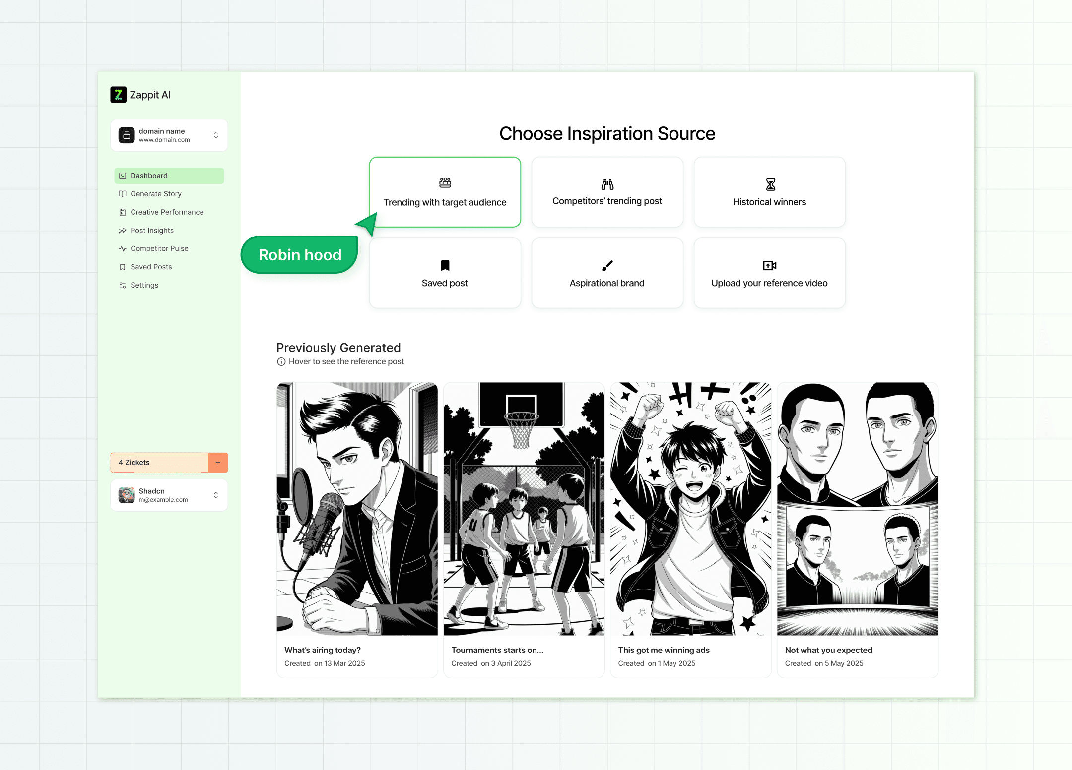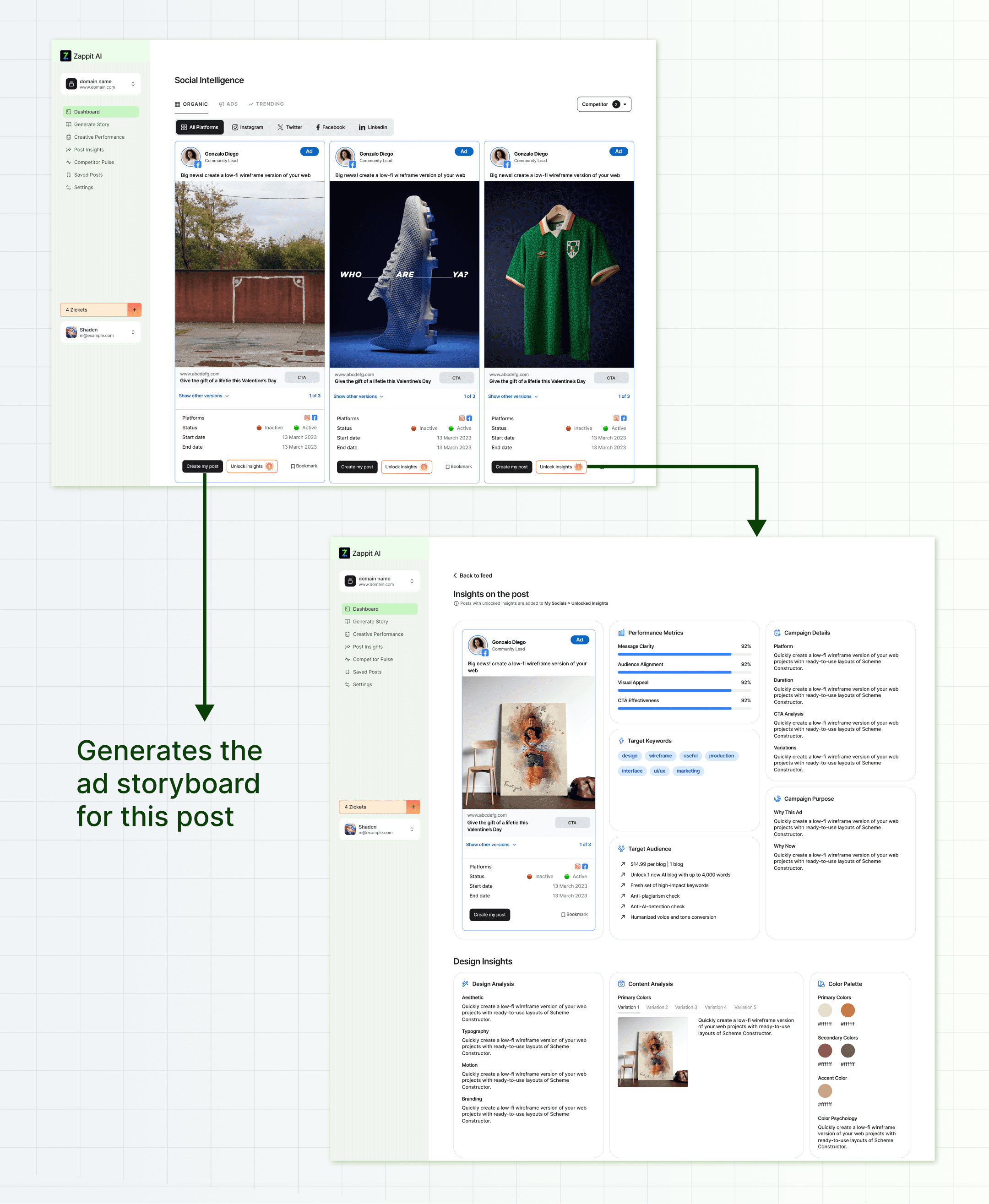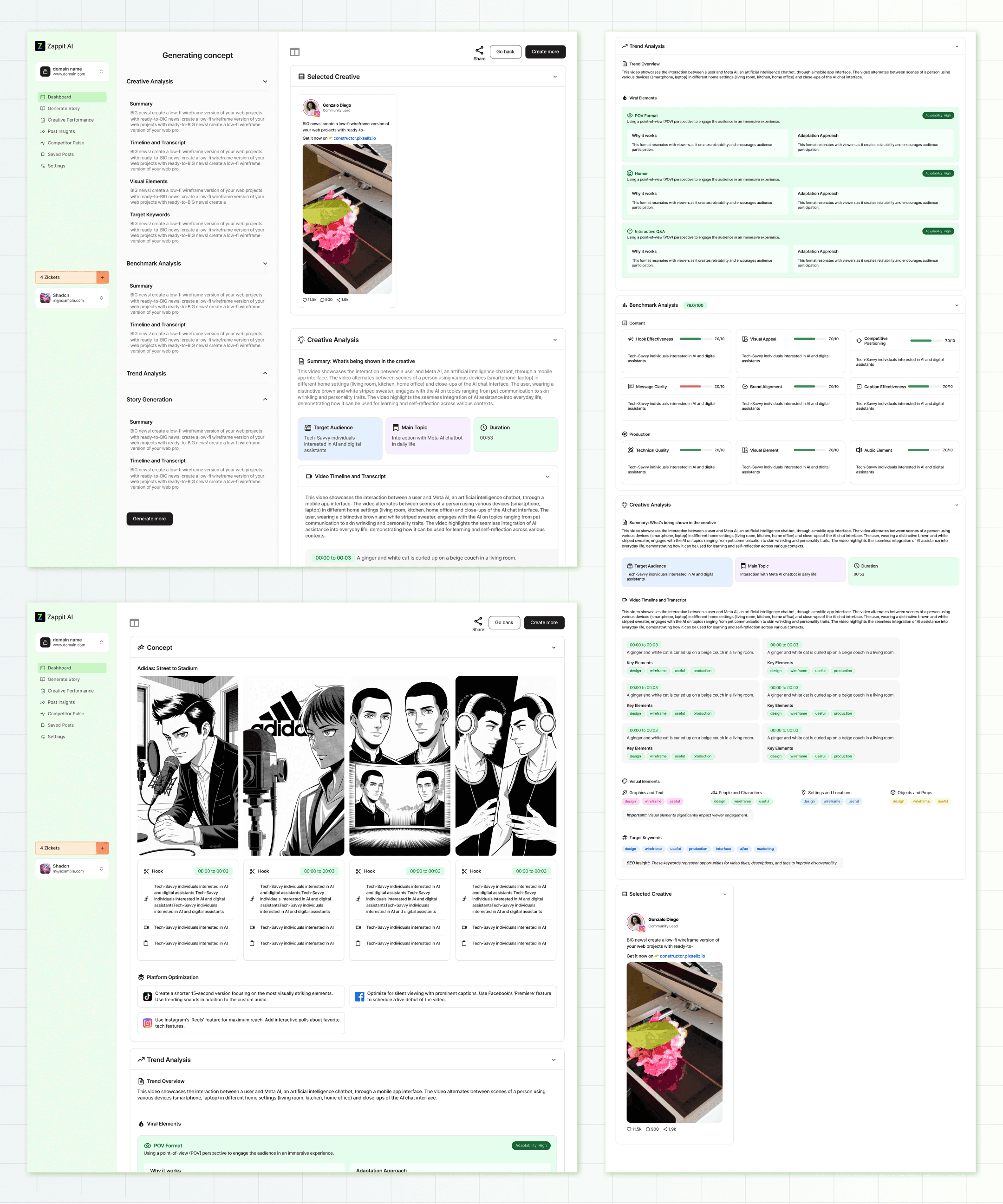 Zappit AI’s dashboard allows users to create an ad storyboard in minutes, streamlining everything from brainstorming to finding inspiration through posts by other brands.