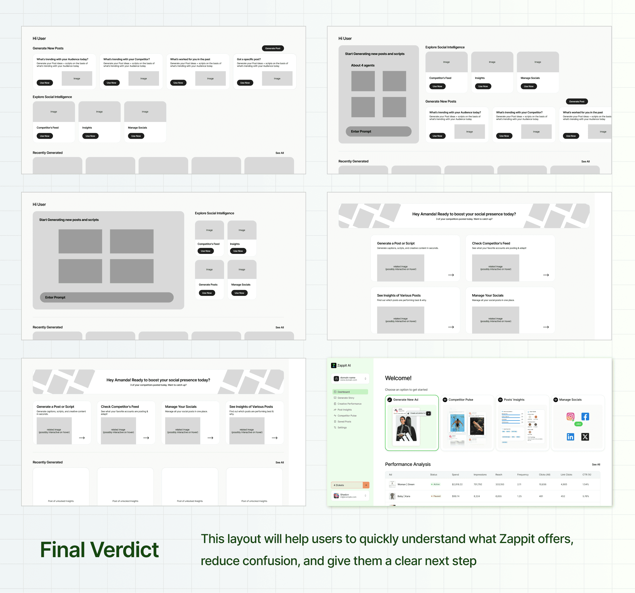 For the dashboard landing page, I sketched multiple wireframes to identify which layout would work best. I was looking for something that: