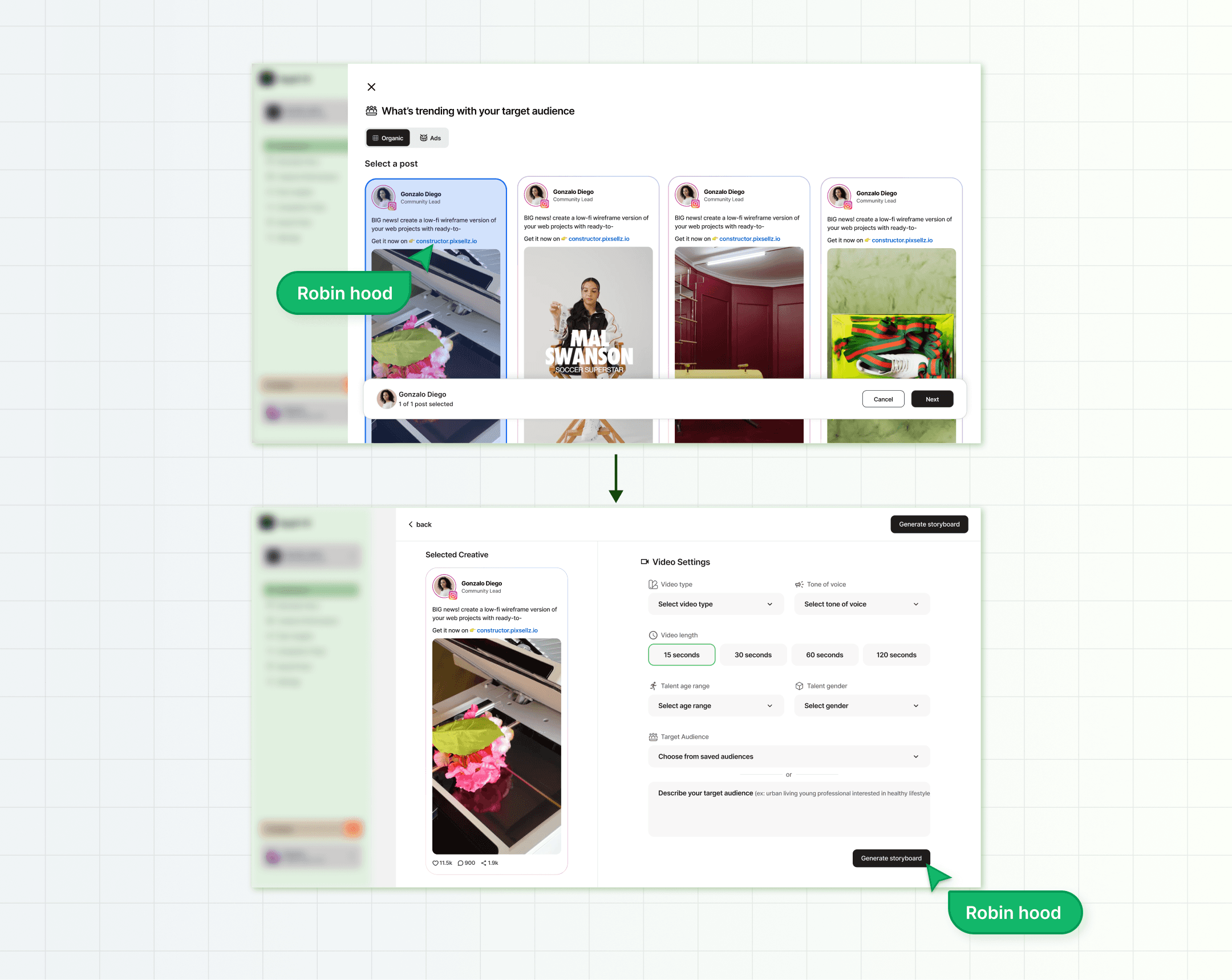 We wanted to show what the AI was doing, from analyzing the content of the inspired post to what’s trending, and finally creating the storyboard. This helped build trust and gave the whole process a bit more meaning.