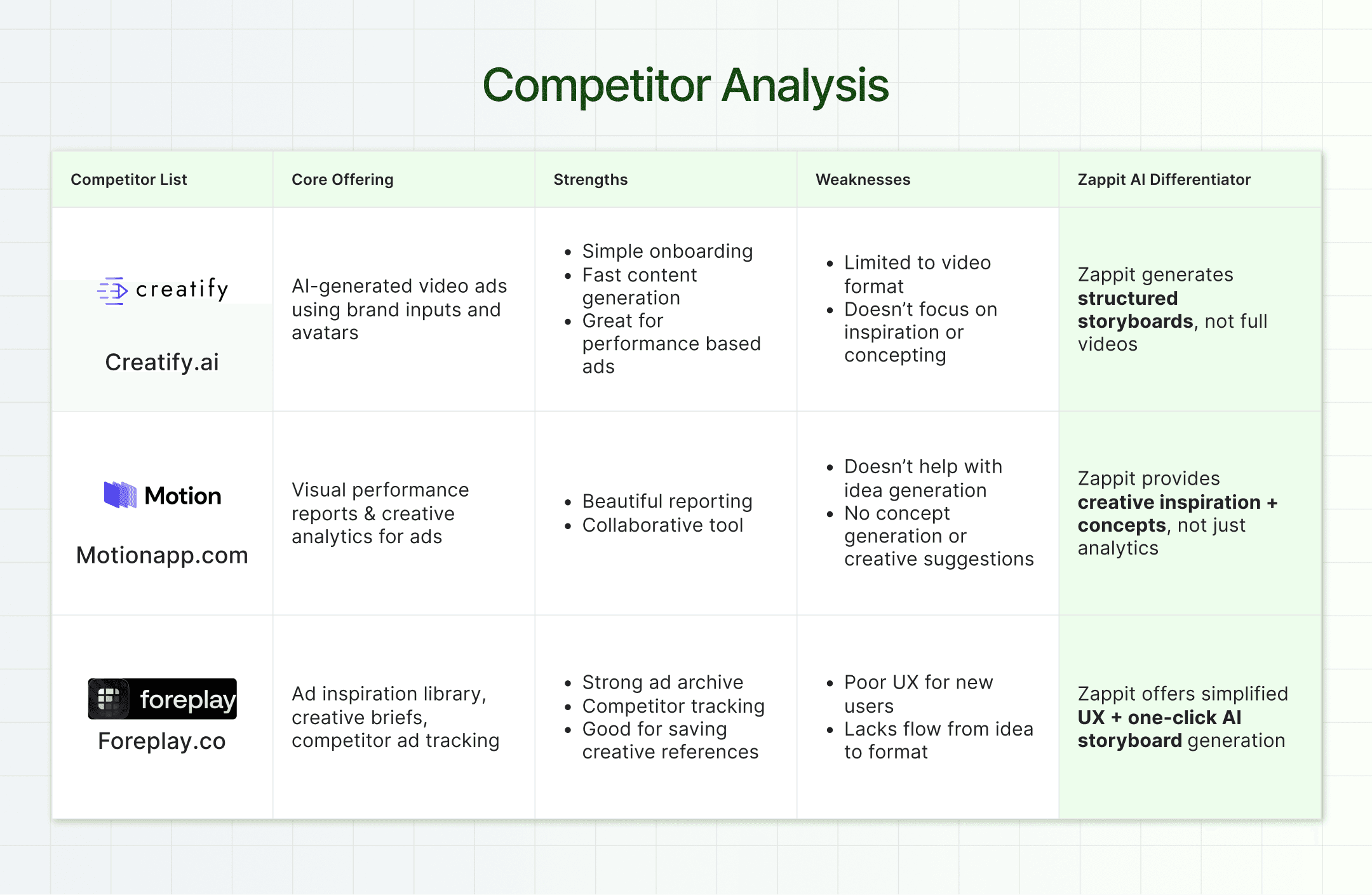 I thoroughly researched similar products to understand how they approach ad creation. I analyzed their user flows, key features, and limitations in comparison to what Zappit aims to offer. My findings are summarized in the table below.
